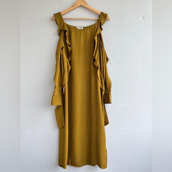 - Style Tags: romantic, wedding guest, modern minimalist, ruffles, cut-out sleeves, warm tones, event, contemporary, midi length, retro, spring