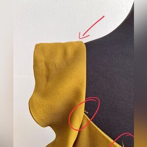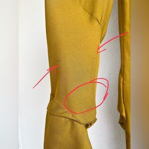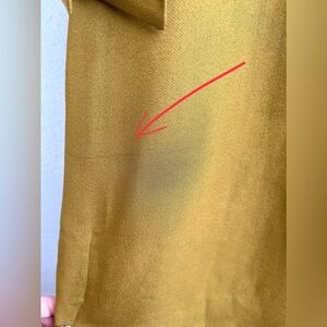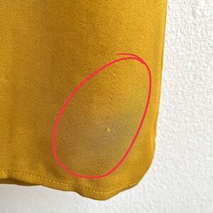 - Flaws: Minor surface pulls throughout and some loose threads near the neckline (see photos 12–14). There’s also a faint horizontal line near the hem on the left side — not visible when worn (photo 15).