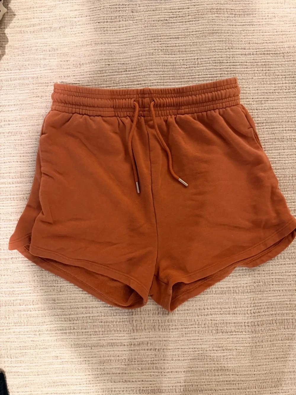 H&M women's athletic shorts with a drawstring waist. Soft, breathable fabric for active days. Side pockets and curved hem for mobility. Casual style in a warm rust tone.