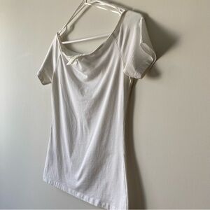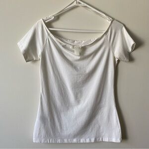 Basic tee. Stretchy all over. Can be worn as a scoop or off-the-shoulders top. Resistant stains on the pits and neck line. Aside from the stains, in good condition.