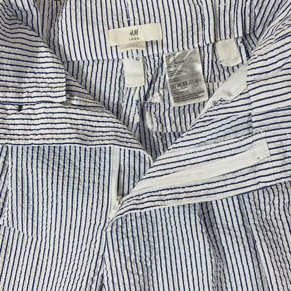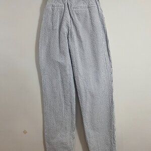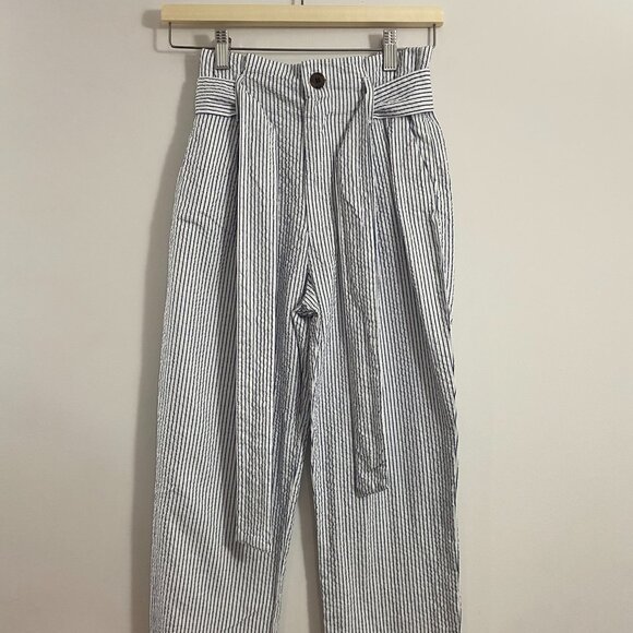 Description: Very chic seersucker, textured pinstripe crop pant with pleated waist, tapered legs, and cute belt.