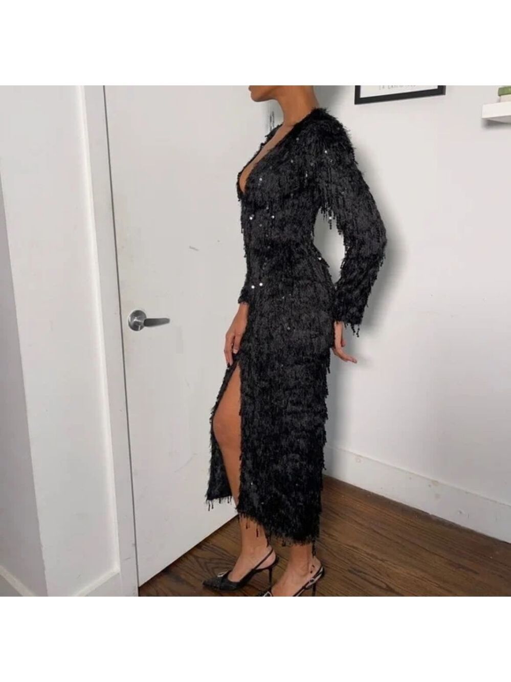 Fitted, ankle-length dress in a fluffy, sequined woven fabric. Low-cut V-neck, defined shoulders, and long sleeves with slit at cuffs. Straight-cut hem with slit at back. Jersey lining.