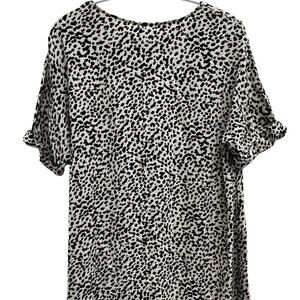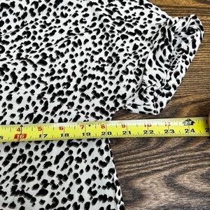In excellent pre-owned condition, 100% Viscose (a type of cotton), short sleeves with cuffs, round neck, animal print. Size 4, see measurements. Dress is 32 inches long from top of shoulder to hem *noteI am not sure if this would be considered a mini dress depends on how tall you are.