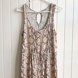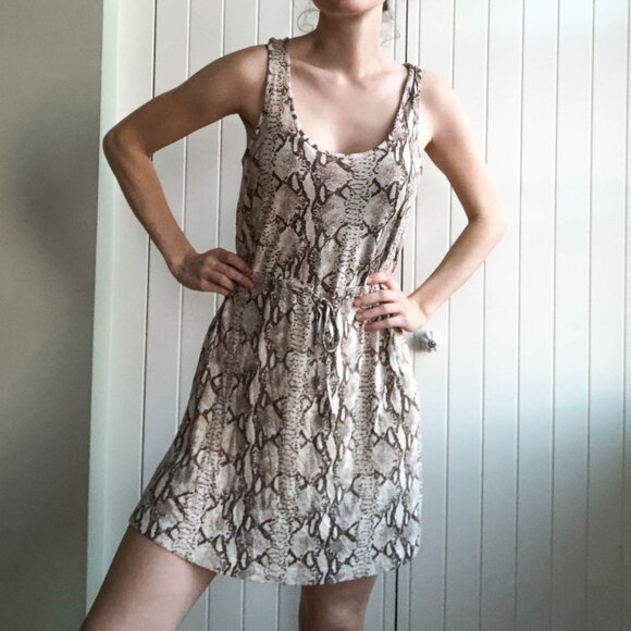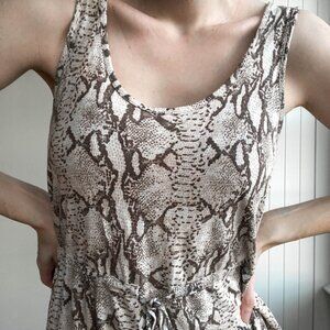 Stylish snake print mini dress. Sleeveless design. Perfect for casual outings.