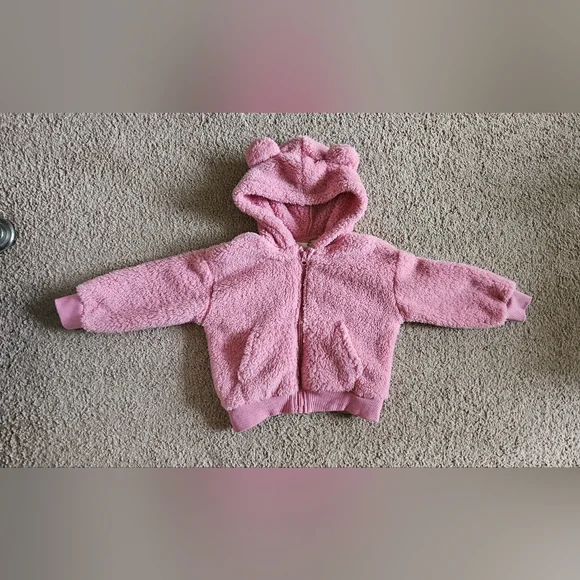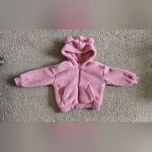 Chic pink fleece jacket. Cute animal ear detail. Ideal for stylish warmth. Very cozy and soft.
