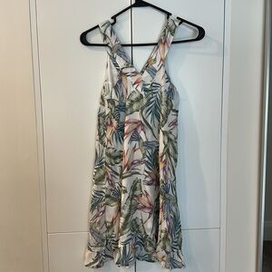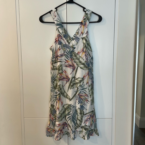 Tropical motifs perfect for a vacation dress with a ruffled trim at the bottom. Worn only a few times. Excellent condition