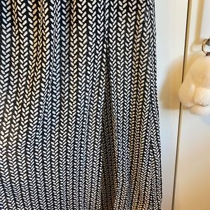 This is a flowy tube black and white leaf print maxi dress. There is lining on the inside up to the knee, as well as a slit on the bottom left. Very flowy material with stretchy elastic waist.