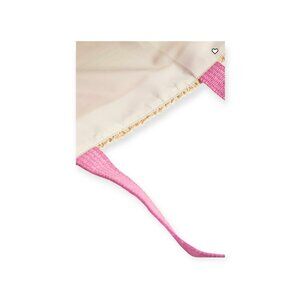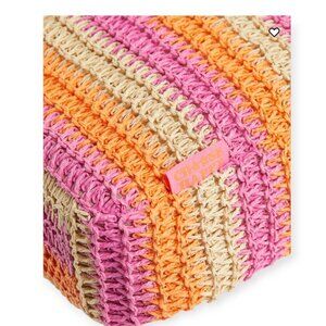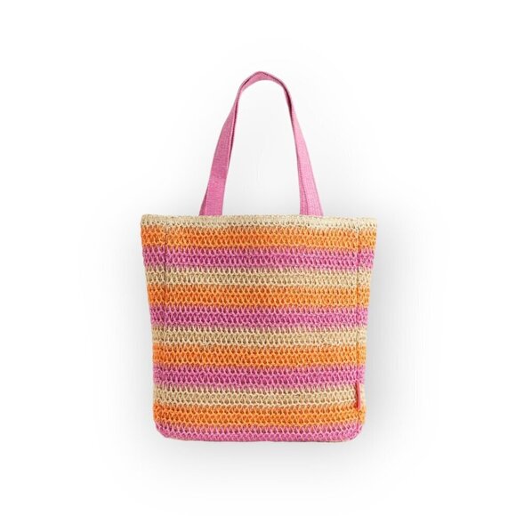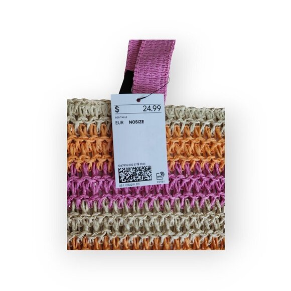 H&M's oversized straw beach bag features a crochet design in pink and orange, perfect for the summer beach look. Constructed with a paper straw exterior and polyester lining for durability.