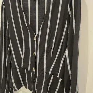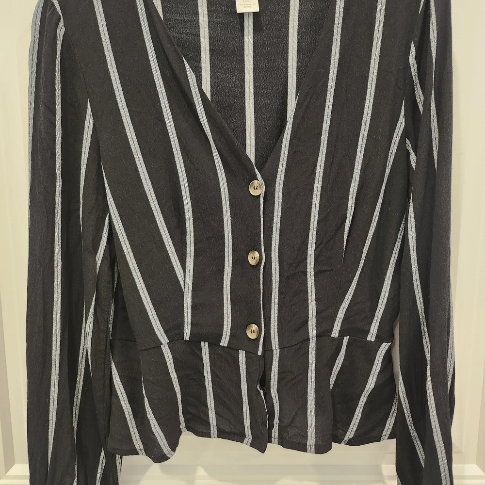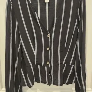 Elevate your style with this chic striped button-up top. Featuring a classic black and white design, it's perfect for any occasion. Pair it with your favorite jeans or skirt for a sophisticated look.