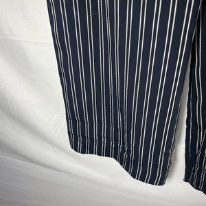 High waisted, navy/white striped dress pant, belt across top, wide leg, front pockets