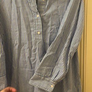 Blue and white striped collared smock dress with half button down and button close sleeves.