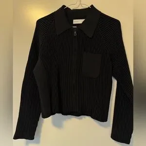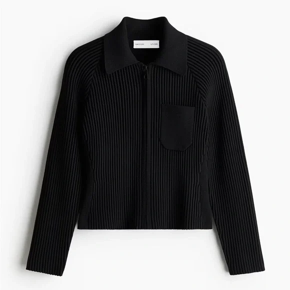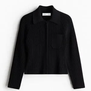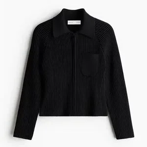 Studio Collection. Top in a raised rib knit with plain-knit sections at the sides for a figure-enhancing effect. Features a collar, tone-on-tone zip down the front, long raglan sleeves and a patch chest pocket.