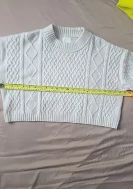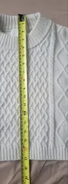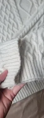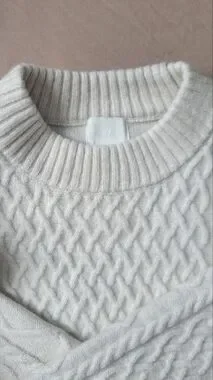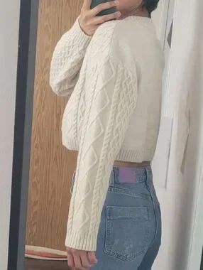 Stay warm and stylish with this classic H&M Cable-Knit Sweater. Featuring a beautiful intricate pattern and a soft cream finish, it’s the perfect piece for those chilly mornings or cozy coffee dates.