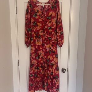 Calf-length dress in woven fabric made from a viscose blend with a deep V-neck and long balloon sleeves in a raglan cut with gathered elastication at the cuffs. Covered buttons down the front, a tie belt at the waist and a gathered seam on the skirt for added width. Unlined.