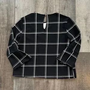 Elegant black top featuring white stripe accents. Sleeveless design with a round neckline. Bell sleeves.