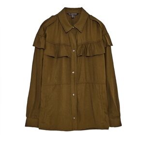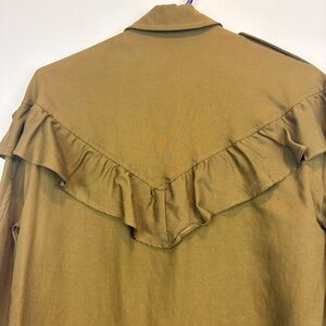 Stylish khaki utility jacket with ruffle accents. Ideal for layering.