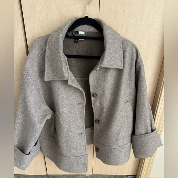 Chic and cozy utility jacket. Features a classic collar and button closure. Ideal for layering. NEVER WORN!!