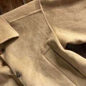 Chic and cozy tan wool jacket. Features button closure and utility style. Ideal for layering.