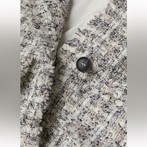 Jacket in woven, textured fabric. Collar, buttons at front, and two large front pockets with flap and integral side pockets.