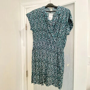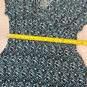 Teal green tropical print capped sleeve and elastic waist, faux wrap looking closure at the top
