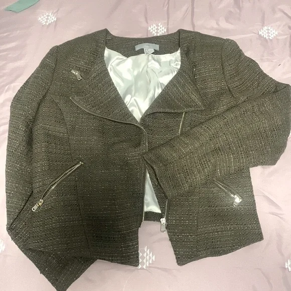 H&M tweed women’s jacket in brown. Tweed material with satin inner lining and silver zippers.