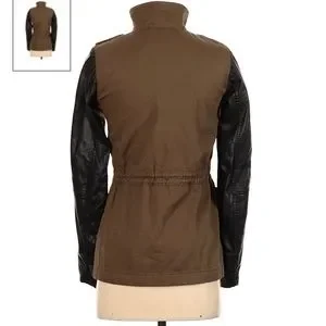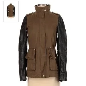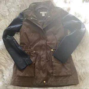 Faux leather sleeves. Flattering fit with adjustable wait drawstring.
