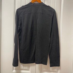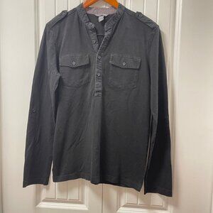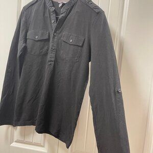 A versatile and effortlessly cool black popover shirt from H&M, featuring details like shoulder epaulettes and dual chest flap pockets. Made from a soft yet structured fabric with a partial button placket and roll-tab sleeves. Easy to style for both casual and smart-casual looks.