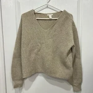 Stay cozy and stylish with this ribbed V-neck sweater. Perfect for layering or wearing on its own, this tan sweater adds a touch of elegance to any outfit.