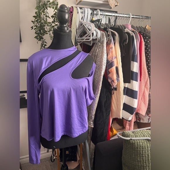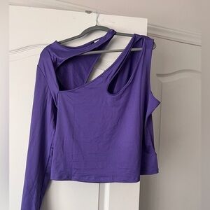 Stylish violet blouse with unique cutout design. Perfect for a modern look.