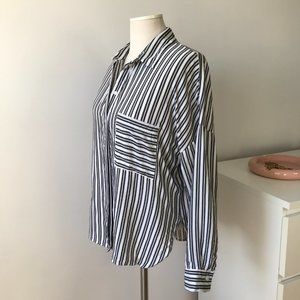 Great condition White and black striped button down blouse. No stains or defects. Light and airy. V-Neck collar. One pocket in the front. Pleaded in the back. 100% Viscose.