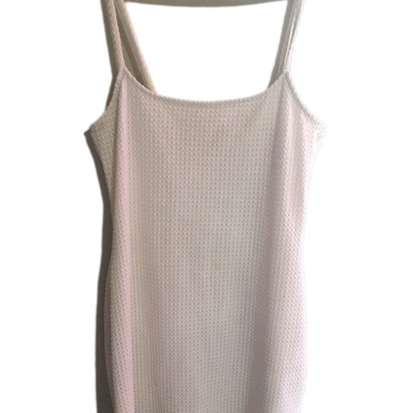 Elegant white mini dress. Sleeveless with a textured pattern. Perfect for any occasion.
