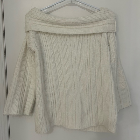 Elegant off-shoulder style. Cozy ribbed knit. Ideal for any season.