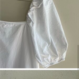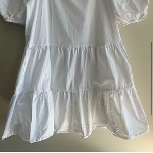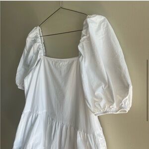 Chic white dress with puff sleeves. Perfect for any occasion.