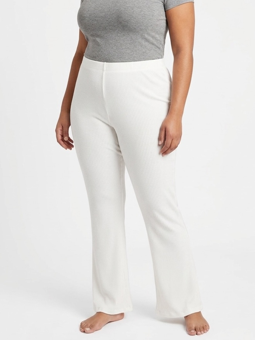 Soft ribbed knit pants with a subtle flare. High-rise silhouette for a sleek fit. Comfortable stretch fabric for easy wear. Minimal, versatile style for multiple looks.