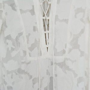 Worn twice on vacation, in like new condition. Size 4 (fits like a S). Lace up at the front, puff sleeves, slightly sheer. 100% polyester. Can also be worn as a dress if you wear a slip under. Perfect for your upcoming summer vacations!