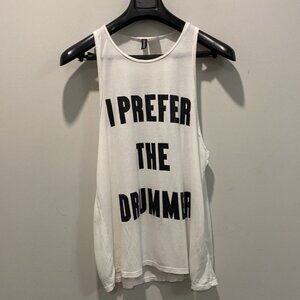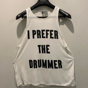 Trending, stylish, popular, cool, blogger style, feminine, date, sale, Women's fun H&M White Tank Top with "I prefer the drummer', everyday, weekend, comfortable, , soft, comfy, effortless, relax fit, oversized, flowy, lightweight, breezy, basic, flattering, flirty, Casual, Cute, girly, pretty, school, college, holiday, streetwear, Coastal, festival, preppy, spring, summer, beach, travel, vacation,