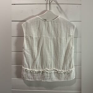 Lightweight white sleeveless top by H&M, featuring a crinkled textured fabric, V-neckline, and button-down front. Adjustable tie at the waist for a flattering fit. Perfect for layering or wearing alone on warm days.