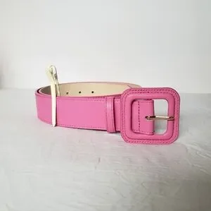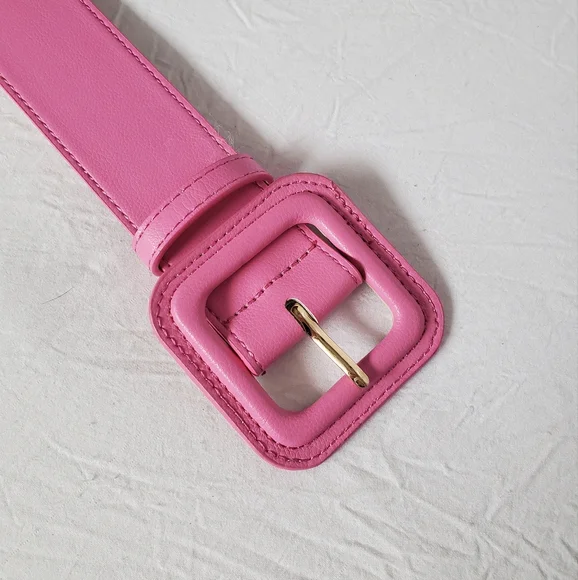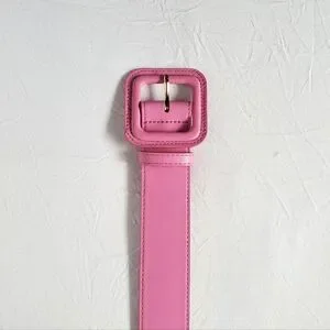 H&M wide faux leather pink belt, with square shaped buckle and gold hardware. Size medium, fits size xs to small. Worn once, in great condition. 94cm from buckle to end. Colour is more bubblegum pink, shown in last photo.