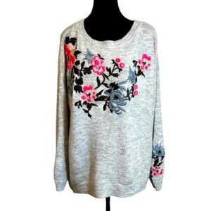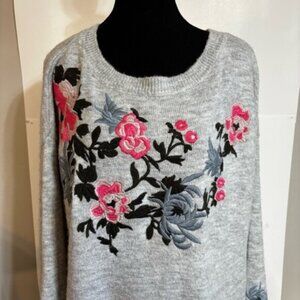 Cozy gray sweater with vibrant floral embroidery. Perfect for adding a pop of color to your outfit.