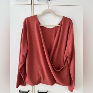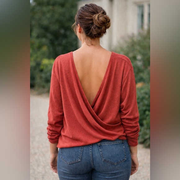 Open back rust long sleeve top, casual chic fall aesthetic, soft lightweight sweater, XL, perfect with jeans, cozy everyday outfit