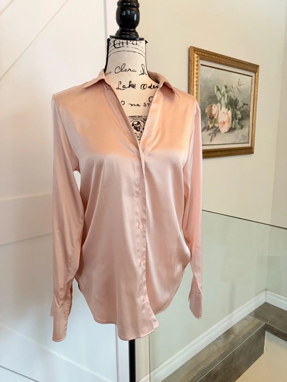 Chic satin button down shirt. Light pink hue. Perfect for elegant occasions.