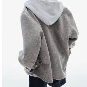 Details: Oversized shirt jacket in soft, woven fabric. Collar, buttons at front, and chest pockets with a flap. Gently dropped shoulders, long sleeves, and buttons at cuffs. Unlined. *See fit on model in last pictures (grey shown in model photo only).