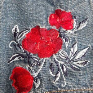 • High rise denim shorts in medium blue wash with rose flower embroidered decoration.