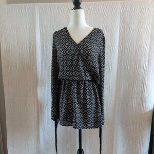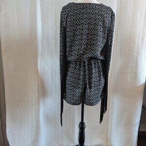 h&m coachella romper, fringe sleeve outfit, tribal print playsuit, boho festival wear, concert capsule staple, black white romper, elastic waist jumpsuit, size 8 fringe outfit, boho chic one piece, music fest fashion, coachella-core romper, western, playsuit