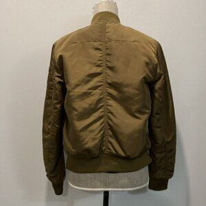 Everyday bomber jacket with two front flap pockets, one sleeve pocket and front gold zipper closure.