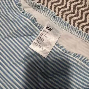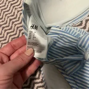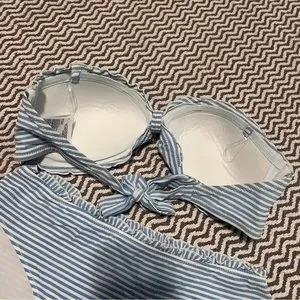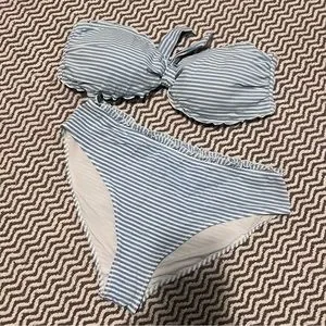 Strapless bikini top with tie front. high waist bottom with frill edges . Blue and white Size 2 bottoms and size 6 top