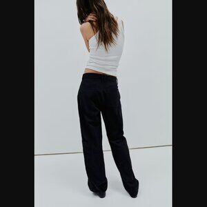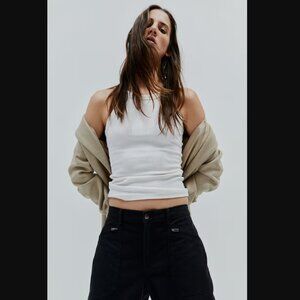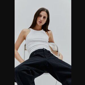 Straight leg cargo pants in Cotton twill. High waist, zip fly with button, and straight legs with a seam below knees. Front pockets with zipper, open back pockets, and a patch leg pocket.