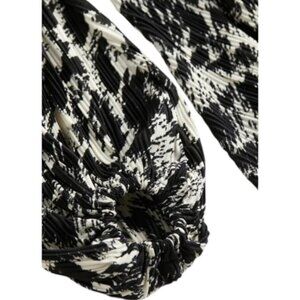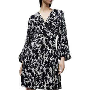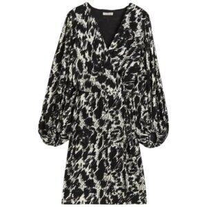 Short plissé dress in woven fabric with a V-shaped neckline. Wrap over front with narrow ties at one side and a concealed button at the other. Long sleeves with gathers over the shoulders and covered elastication at the cuffs. Partly lined.