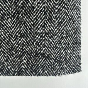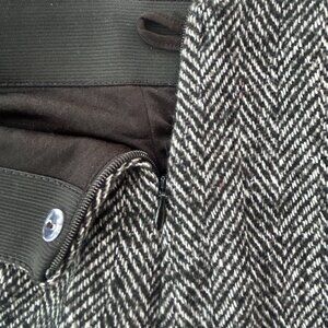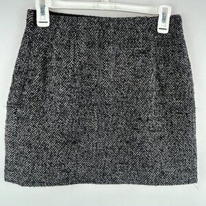 Classic wool-blend mini skirt featuring a timeless black-and-white chevron weave. Fully lined for comfort and fitted with a side zip closure plus an inner button fastening for secure wear. Includes the original spare button sewn inside. Soft wool blend that is not itchy, offering a polished preppy look perfect for fall and winter layering.