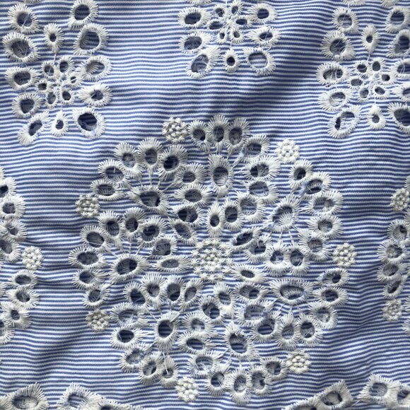 Blue and white stripes with beautiful eyelet / broderie anglaise design at the bottom.